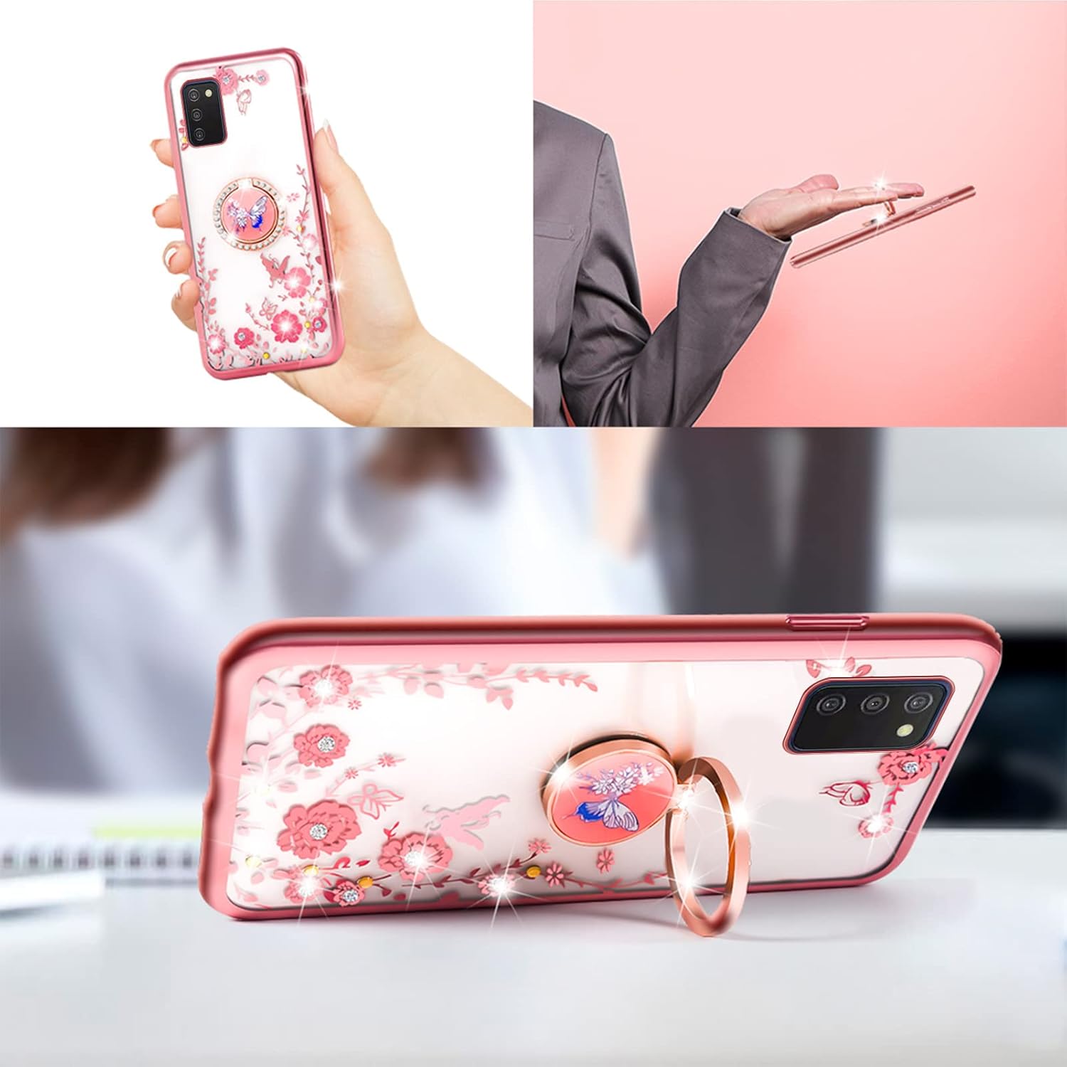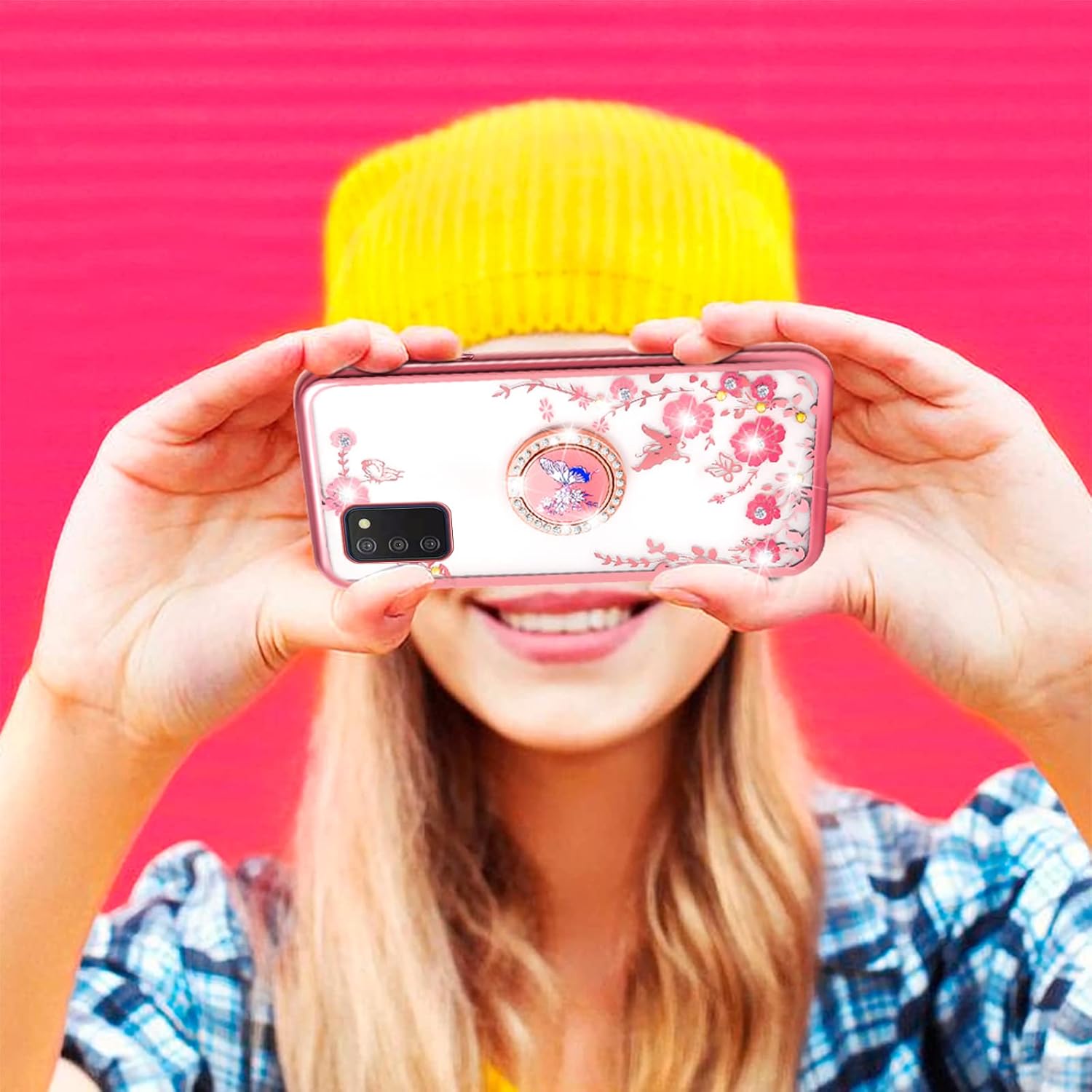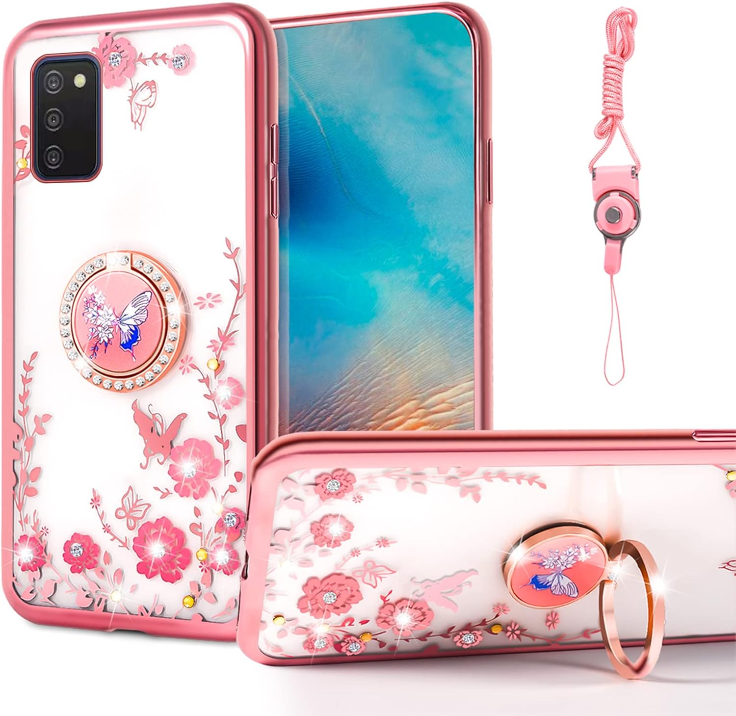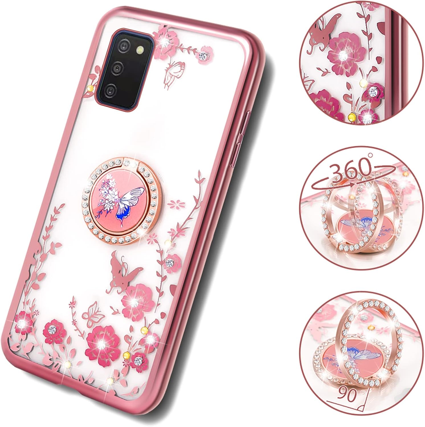 nancheng for Samsung A03S Phone Case, for Galaxy A03S Case Cute Clear Pink Butterfly Flower Soft TPU Shockproof Protective Cover with Ring Stand Girls Women Case for Samsung Galaxy A03S-Rose Butterfly