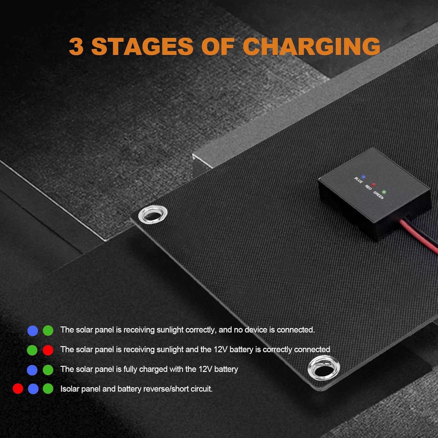 【Safety Protection】Built-in intelligent MPPT controller, intelligent three-stage charging algorithm effectively prevents the battery from over-charging, over-voltage, discharging, short-circuiting, etc. The three-colour LED indicator helps to intuitively monitor the working status of the solar panel and the battery.