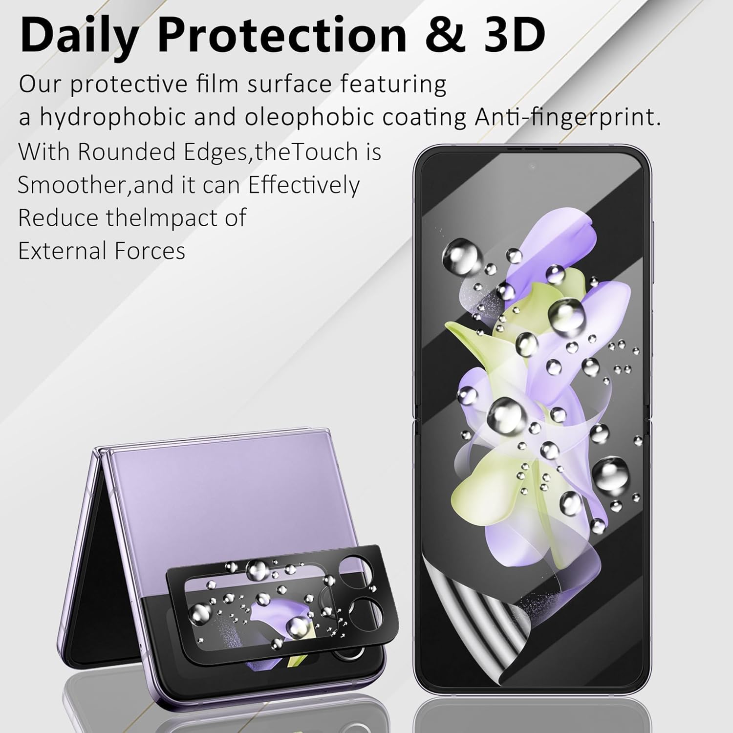 ✔【 Oleophobic Nano Coating】 Inner screen protector It adopts premium quality TPU Flexible materials, thus creating an oil-resistant, anti-fingerprint, Highly durable, screen protector for Samsung Galaxy Z Flip 4 and easier to clean and protect against sweat effectively.