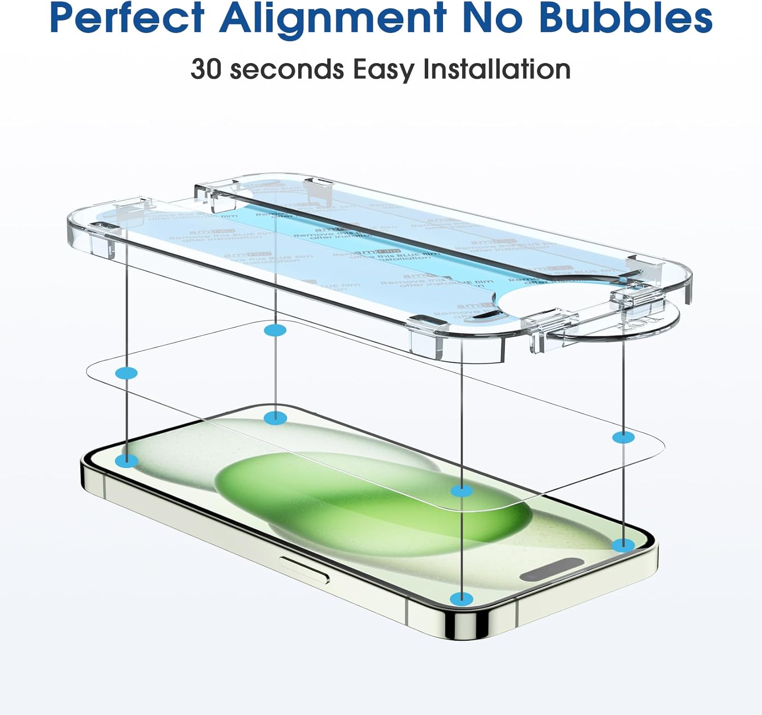[2+2 Pack] iphone 15 Plus 6.7″ Screen Protectors, two auto alignment tool kits (screen protectors come pre-installed in the auto alignment tool) ,two installation accessory kits and one glass camera lens protector.