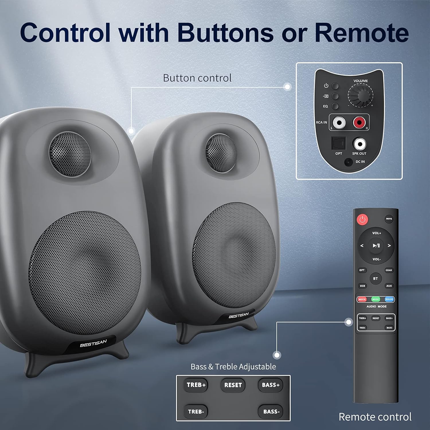 Control your bookshelf speaker Remotely: handle your bookshelf speaker from the comfort of your couch or directly on the device; combine with bass & treble adjustable function to match your favorite sound.