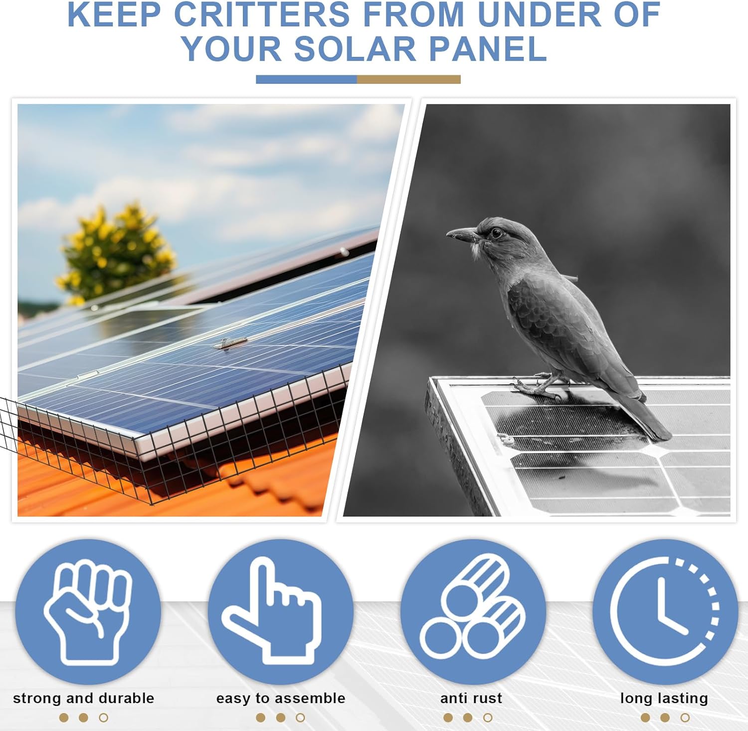 Widely Applied: our critter guard for solar panels avoid these animals from messing up our roof; The high malleability makes it easy to install around ducts, railings and vents, and the black coating blends in with the solar system to create an independent appearance that adds a beautiful and elegant look