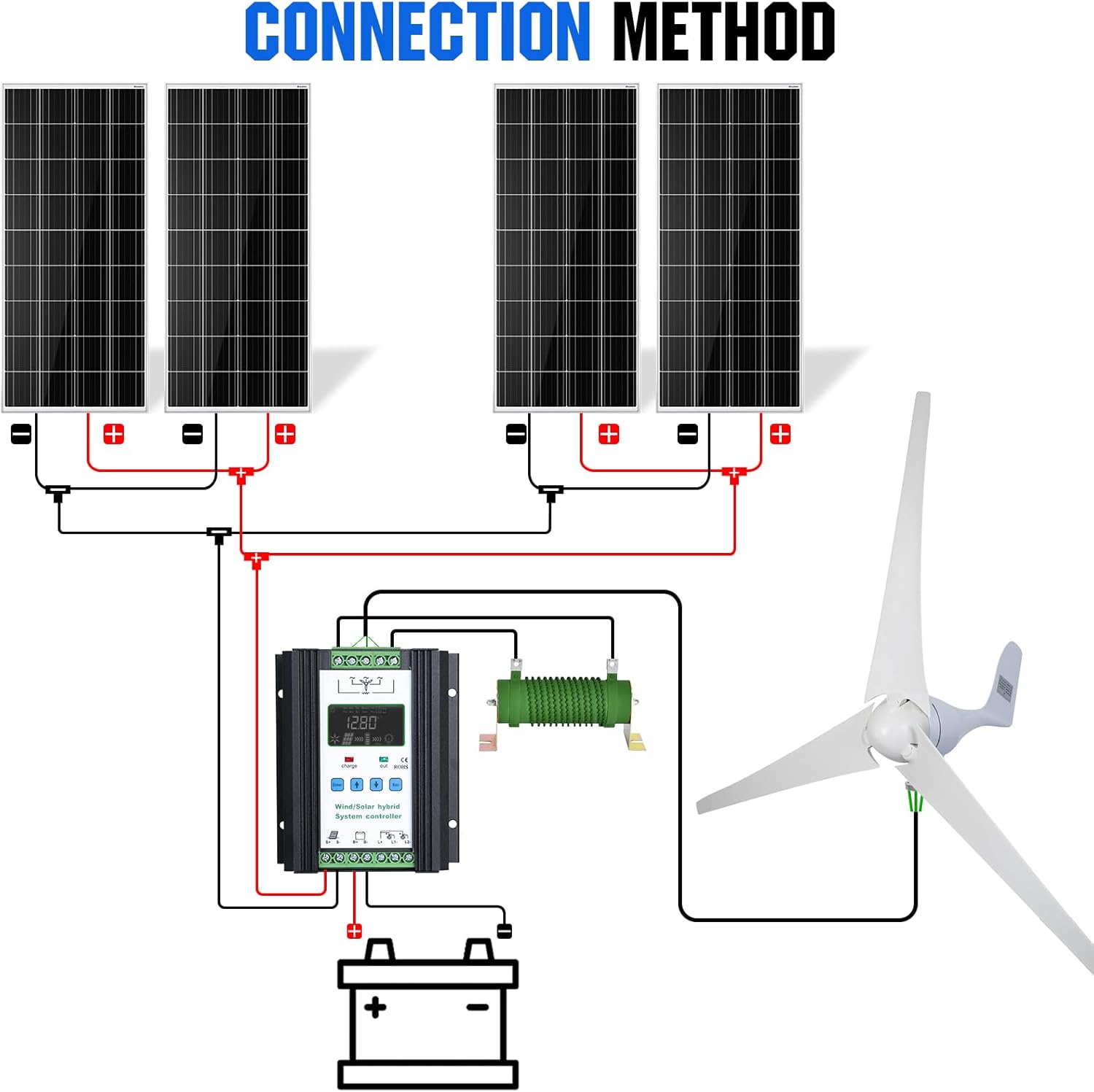 【PWM Hybrid Controller】: Our solar wind power kit includes a 20A PWM Hybrid Controller for battery protection. It can automatically shut down when the battery is fully charged, protect it from overcharge and short circuit.