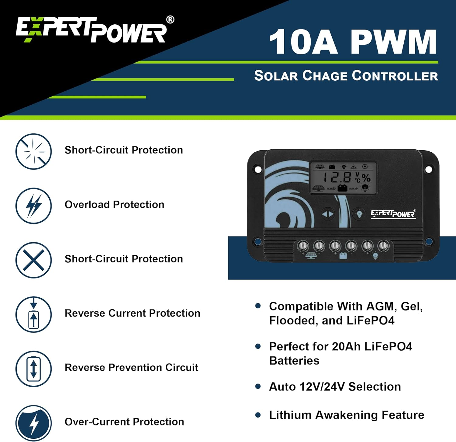 ExpertPower 100W 12V Solar Power Kit with Battery : 100W 12V Solar Panel + 10A Charge Controller + 21Ah Gel Battery