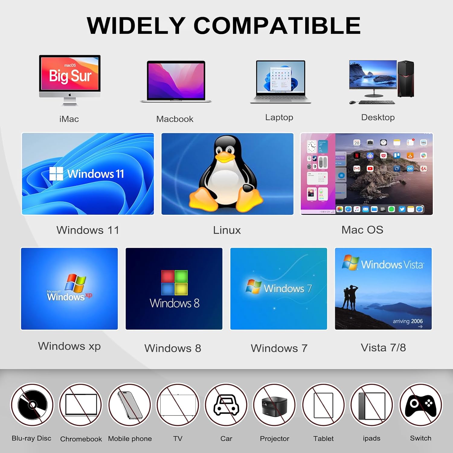 💽【Wide compatibility】 The external CD drive for laptop is compatible with Windows XP / 7 / 8 / 10, VISTA, Mac OS 8.6 or higher, Windows 11 requires VLC media player. And serves as a perfect complement for APPLE / DELL / SONY / SAMSUNG / ASUS / ACER / HP, notebooks , Ultrabooks, PCs, desktops and other brands without an internal drive (not compatible with Windows98! ). External CD DVD drive for pc – Working with USB 3.0 High Speed interface, brings you faster data transfer speed (up to a maximum of 5Gbps).