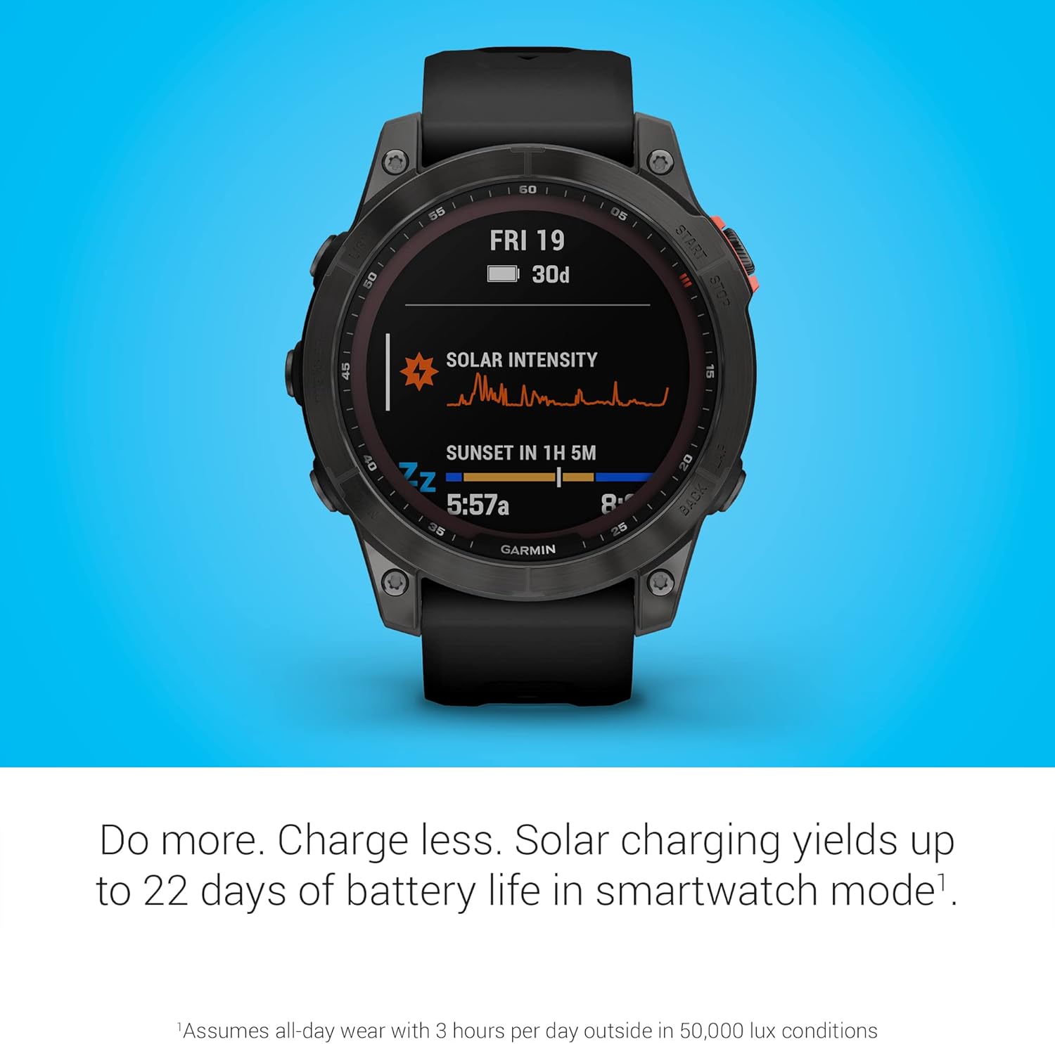 Garmin fenix 7 Solar, adventure smartwatch, with Solar Charging Capabilities, rugged outdoor watch with GPS, touchscreen, Slate Gray and Black Band One Size