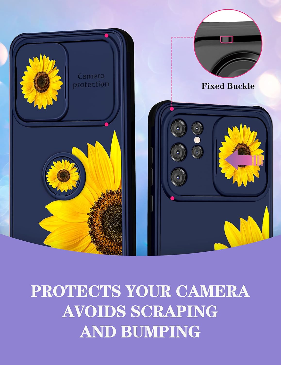 Goocrux (2in1 for Samsung Galaxy S21 Ultra Case Sunflower Floral for Women Girls Girly Phone Cover Cute Flowers Design with Slide Camera Cover+Ring Holder Unique Blue Cases for Galaxy S21 Ultra 6.8”