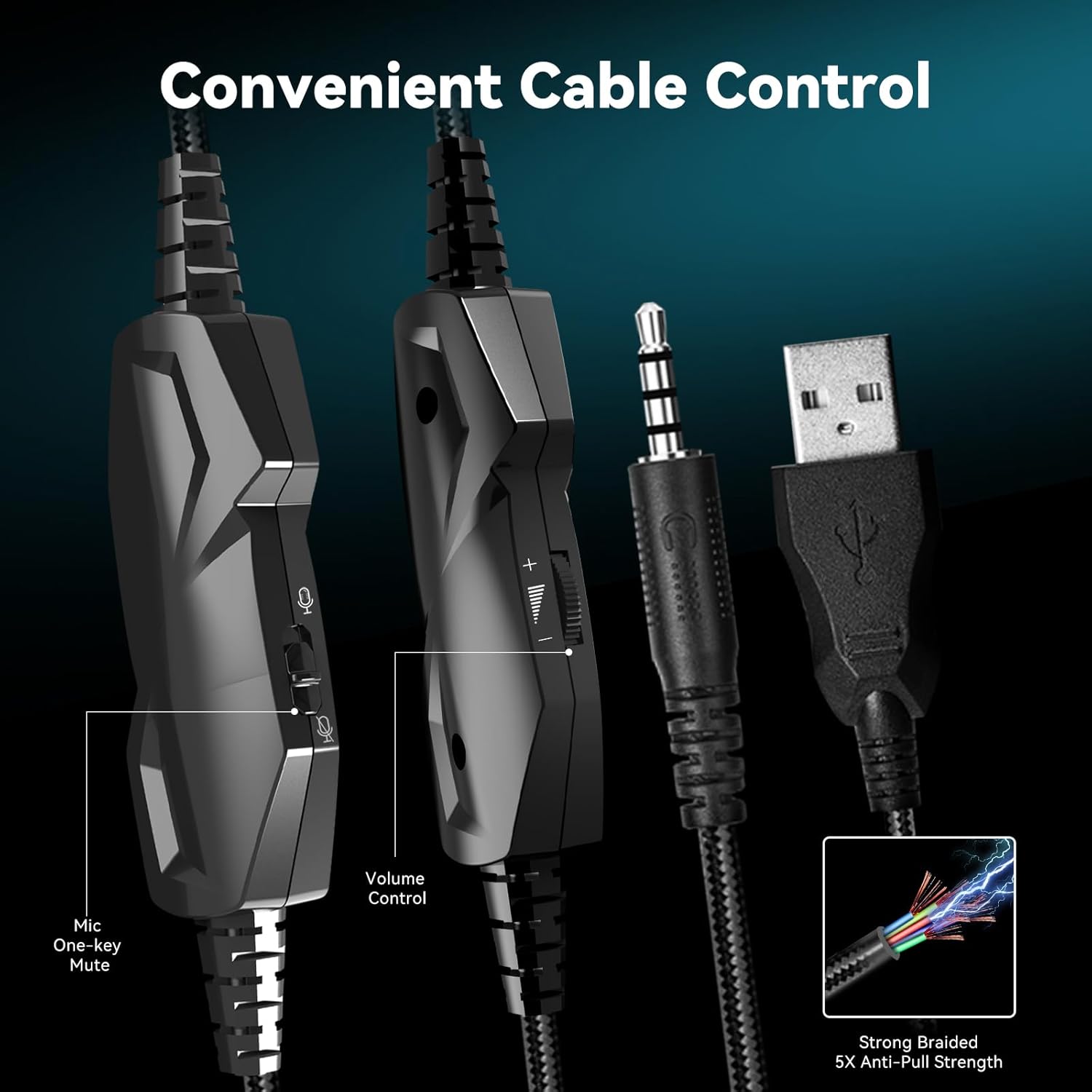 【Professional Gaming Headset】Gaming headphones with 6.5ft high tensile strength, anti-tangle braided cable, rotary volume control and button microphone mute.