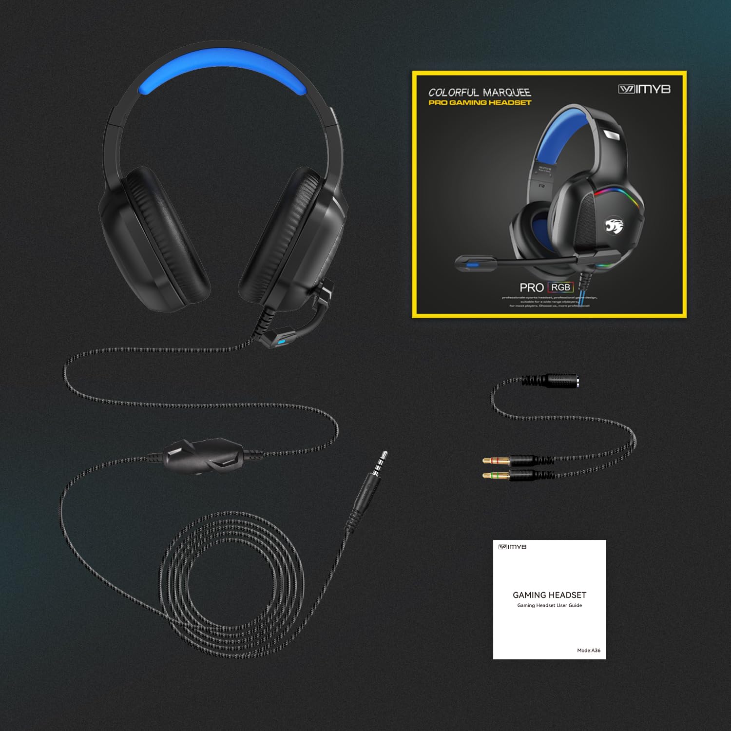 IMYB A36 Gaming Headset with Microphone for Pc, Xbox One Series X/s, Ps4, Ps5, Switch, Stereo Wired Noise Cancelling Over-Ear Headphones with Mic for Computer, Laptop, Mac, Nintendo, Gamer (Blue)