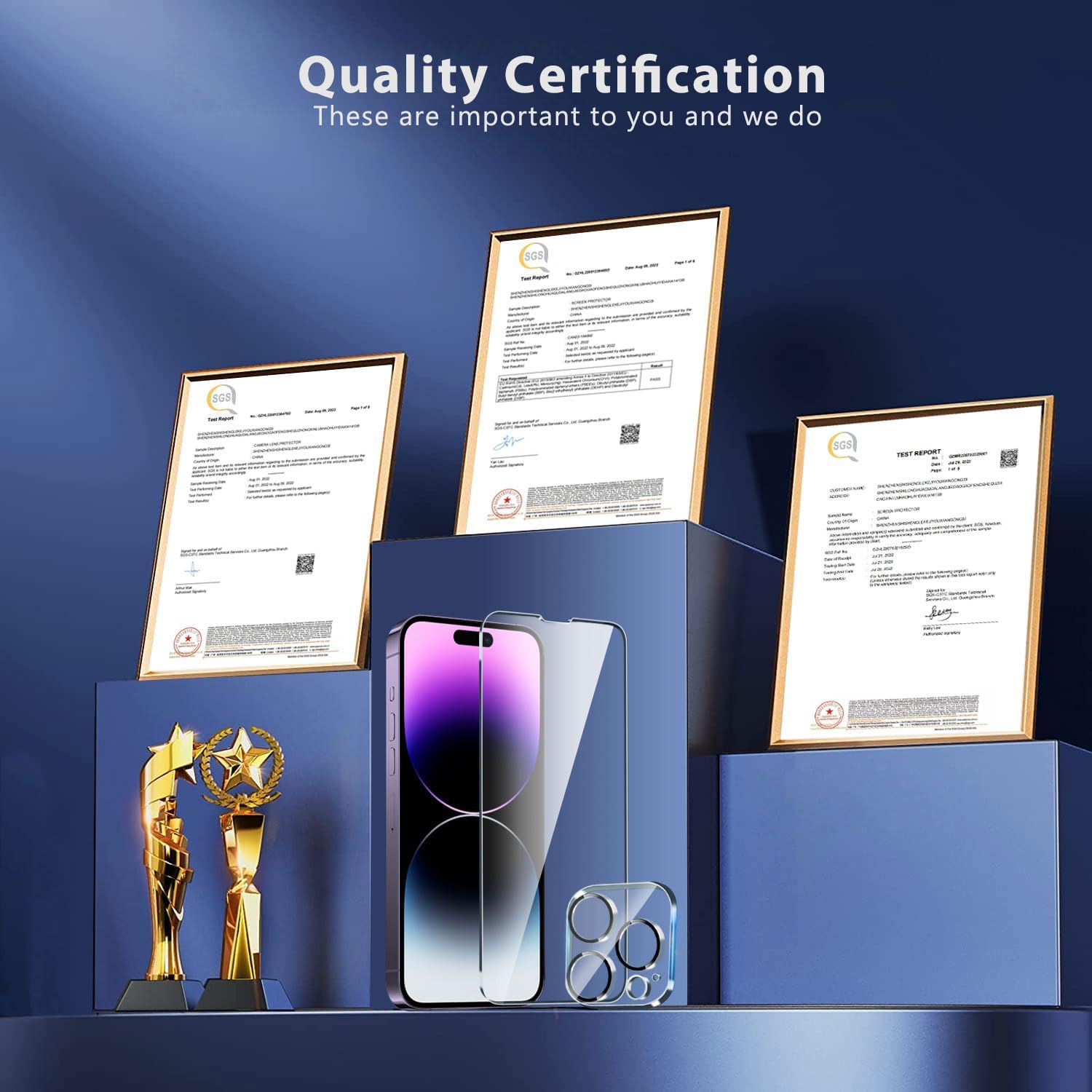[RoHS Environmental and Drop Test Certification]: QHOHQ Tempered Glass and camera cover with 9H hardness tested, Certified screen protector can withstand a 6-foot drop without damaging your phone screen,and reach 99.99% light transmission test , At the same time, the products have passed the RoHS environmental protection test report (certificate NO.: GZHL2208123848SD and GZHL2208123847SD), meet international environmental standards.