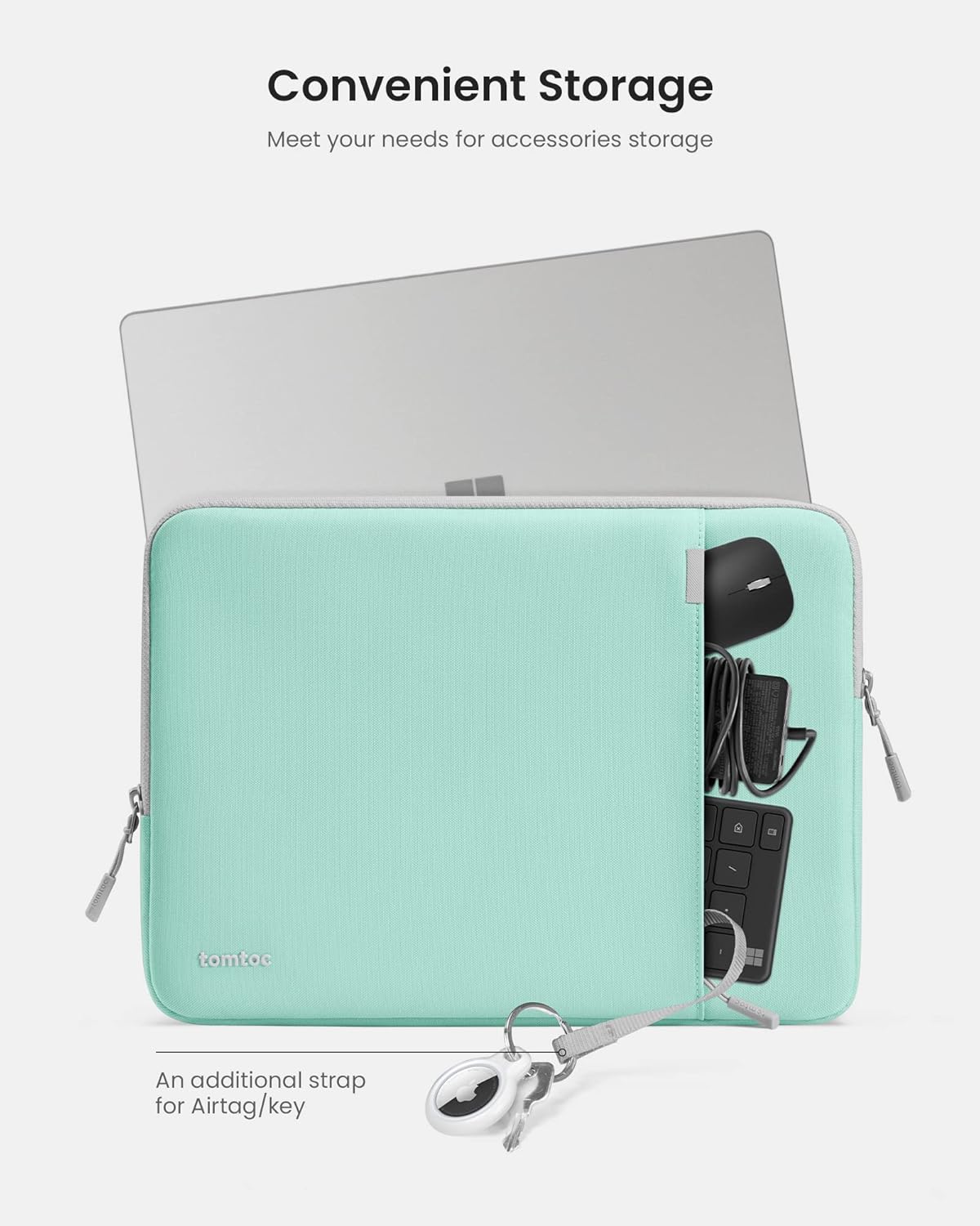 Convenient Storage: Laptop is never the only thing you need to take. Maybe your charger, cable, mouse, external backup drive, etc. The extra front pocket makes go with just the case possible. And an additional strap is designed here for your AirTag or key