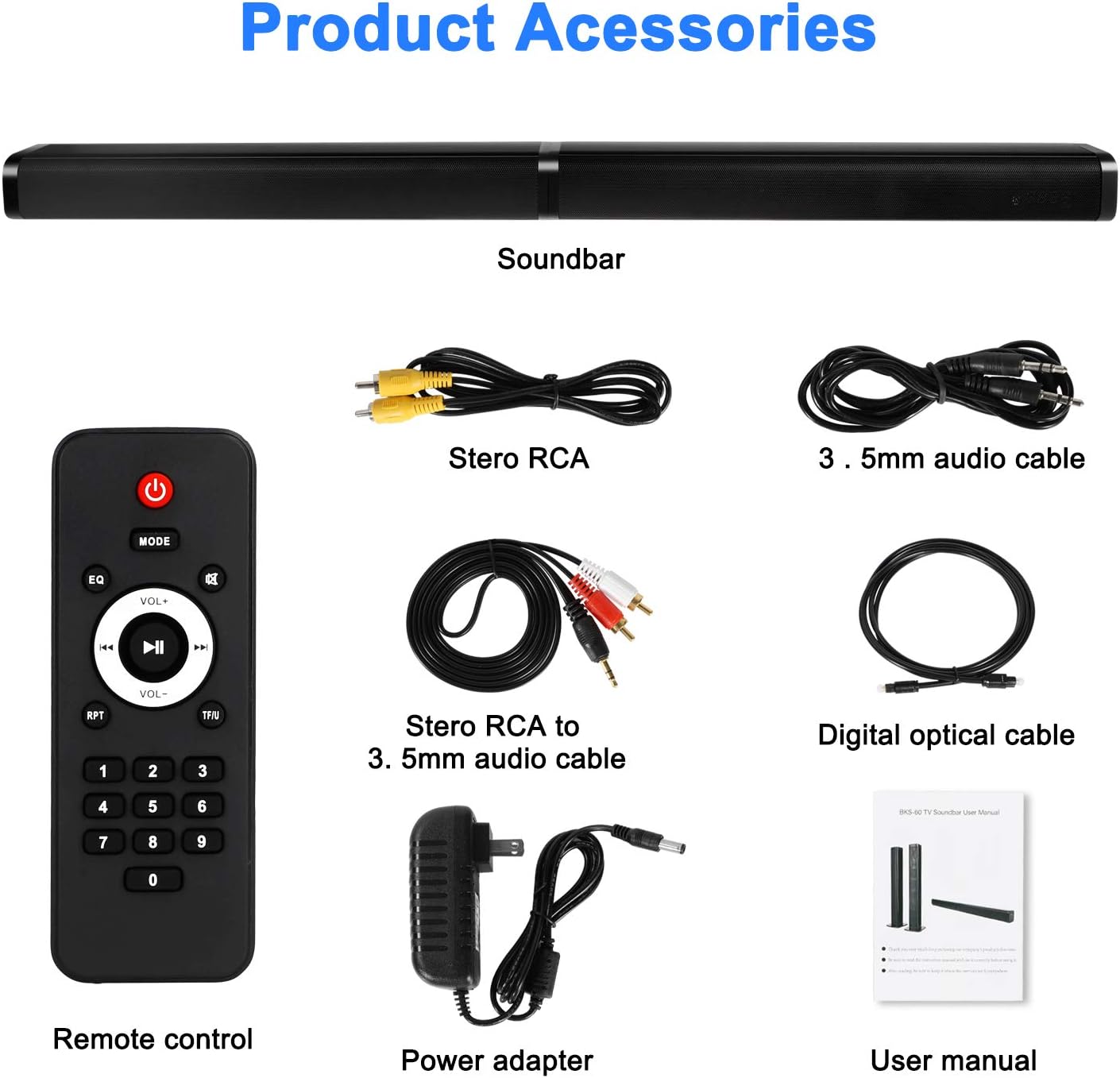 3D Stereo Sounds for TV: Experience dynamic and immersive audio with our 40W TV Sound Bar. Our advanced speaker system features four drivers that accurately reproduce every sound, from subtle details to thunderous explosions. You’ll feel fully immersed in the movie scene, as if you’re right there in the action. TV Soundbars Operation: When you choose the OPTICAL or AUX connection to connect your TV to our soundbar, please kindly ensure the jack on your tv is specifically labeled OPT Aux out. (Optical / AUX in does not work). If there is still no sound coming out, please press speaker in ‘M’ to change to Opt or AUX Detachable Sound Bar Speaker: Our soundbar can be separated into two small tower speakers connected with a base, creating a dynamic and immersive vertical combination sound experience that can be placed on either side of your TV. You can also combine the two parts to become a regular long soundbar (950*60*60 mm) and seamlessly integrate it into your home theater system while complementing your home decor. Easy Setup: Setting up our soundbar is a breeze, with support for Optical/AUX/Bluetooth connections for almost all devices, including the more stable Bluetooth 5.0 connection. Our soundbar comes with illustrated instructions, videos, and all the necessary mounting accessories. Reliable Lifetime Support: Experience the exceptional quality of our soundbar, backed by a lifetime warranty and reliable customer support. Our team is always available to provide any support you need within two days. The package includes the TV Soundbar, Remote Controller, Power Adapter, Optical/RCA/3.5mm audio cable, base, quick installation instructions, and user manual.