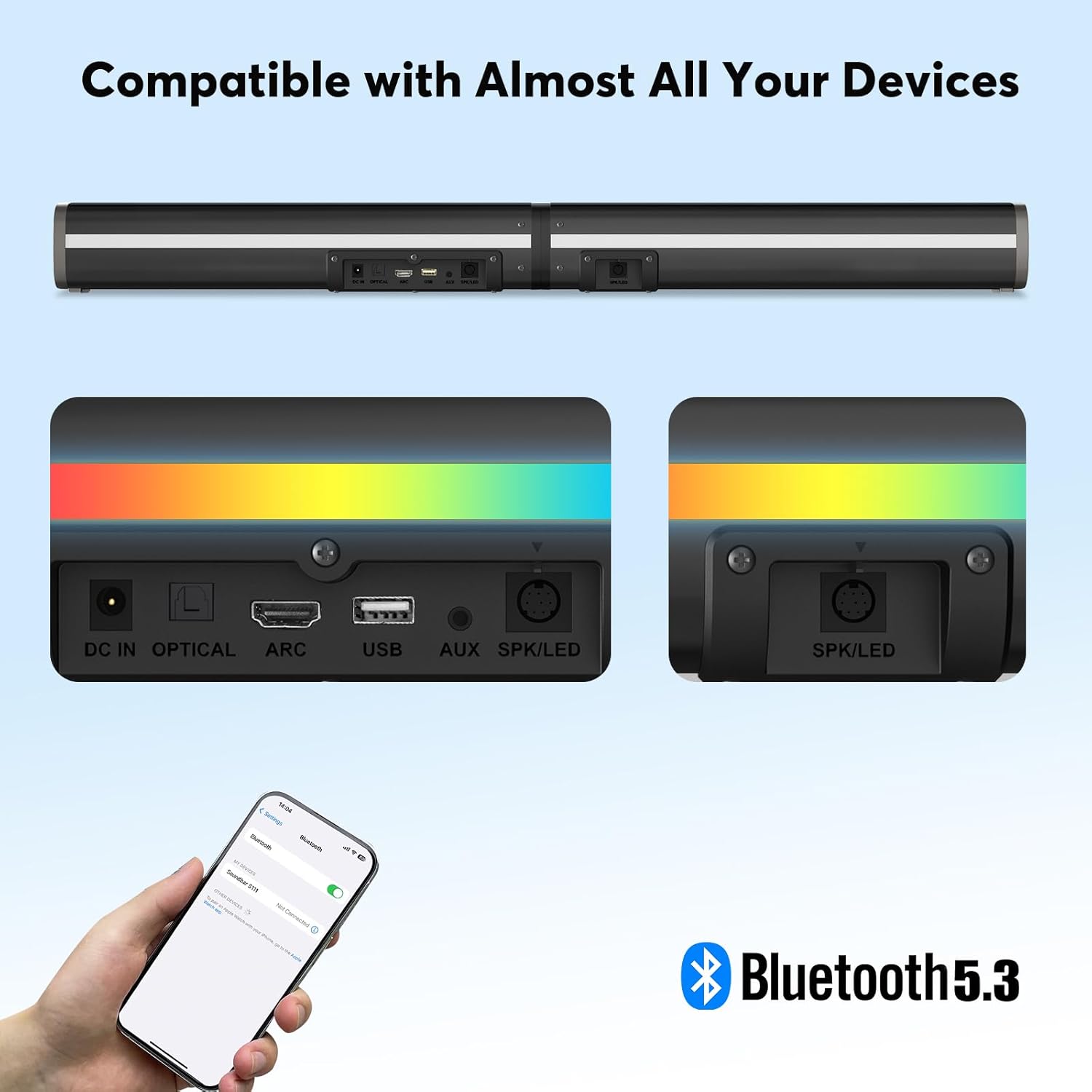 Wohome 2.2 Sound Bar for Smart TV with Built-in Subwoofers, 32 Inches Detachable Soundbar Speaker, Bluetooth 5.3/ARC/Optical/AUX/USB Connection with Colorful Backlight (Black-no ARC Cable)